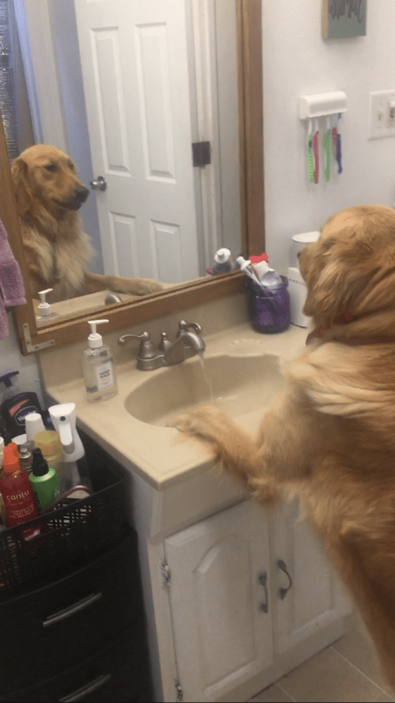 Leeli is one of the most distinctive golden retriever you’ll ever meet. After getting a drink and washing her paws, she checks herself in the mirror to make sure she’s still looking great!